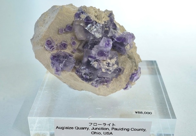アメリカ、オハイオ州Auglaize quarryの母岩つきフローライトです。 キャビネットサイズ 藤色と濃いバイオレットのフローライトが砂岩らしき母岩の上にたくさん乗っています。 たくさんのキューブ状フローライトは、紫のコアに透明な藤色のゾーニングが被さった、二重構造のフローライトです。 たくさんついていて、一つ一つ見応えがあります。 オーグライズ採石場は現在も稼働している建築用石材の採石場です。 アメリカの東側、カナダとの国境にも面しているエリー湖の近く、オハイオ州の北東部にあります。 採石場の名前は、オーグライズ川に近いことに由来しています。 イリデッセンスフローライトの産地として国際的に認められています。 産地:Auglaize Quarry, Junction, Paulding County, Ohio, USA サイズ: 63×57×48 mm