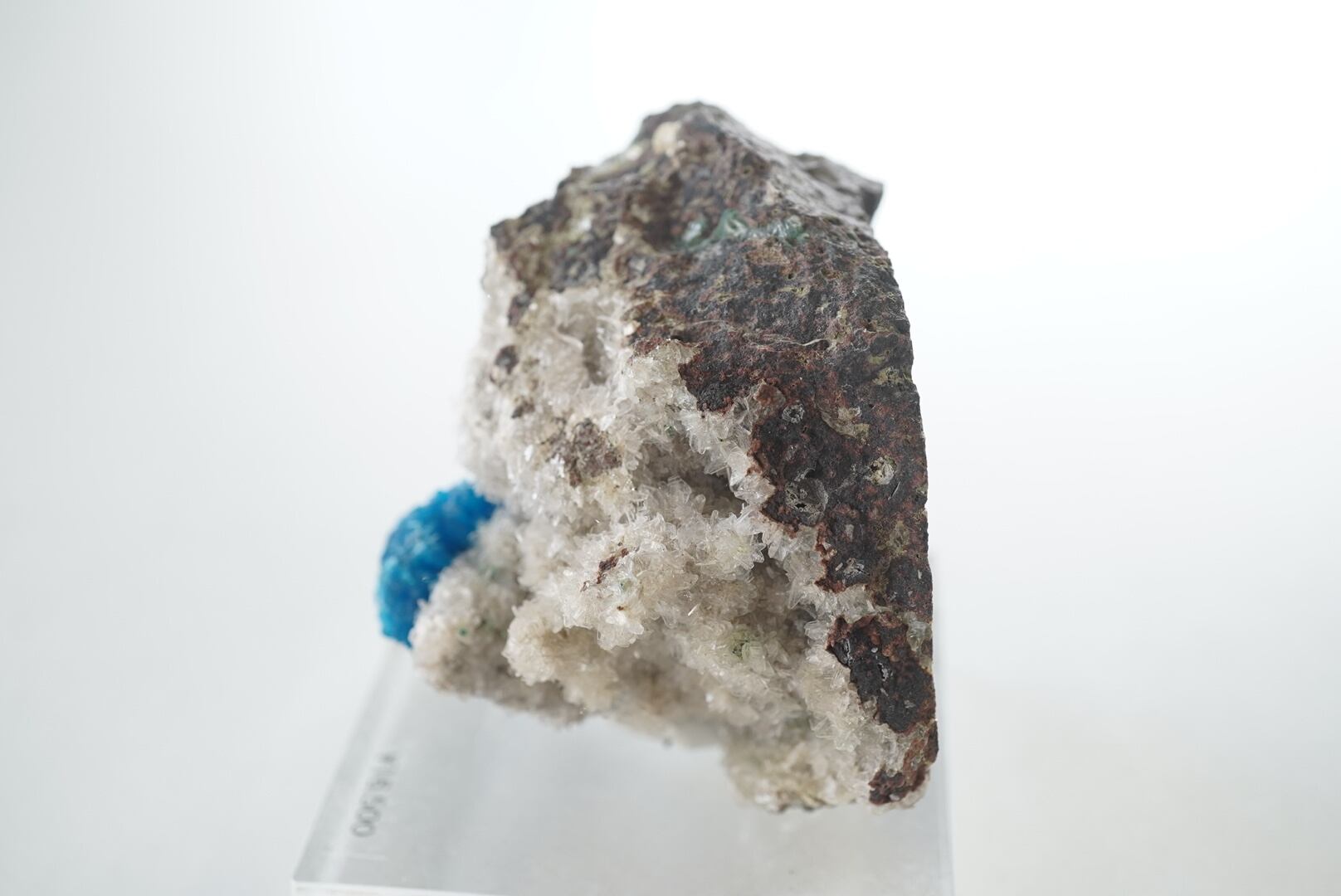 鮮やかな濃い青緑のカバンサイトの結晶が乗った標本です。