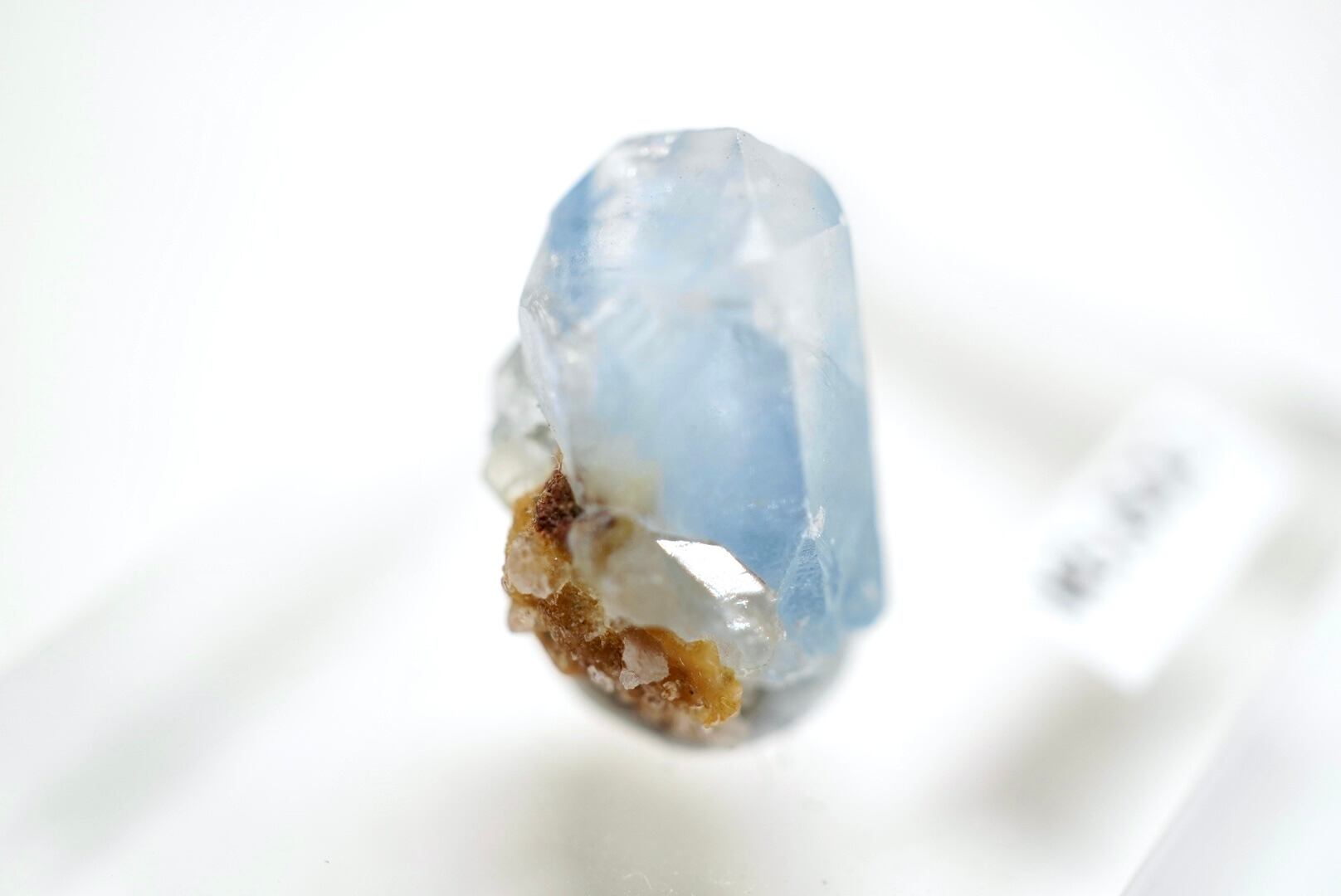 黄色い母岩の上に、淡い小さな水色のセレスタイトの結晶が乗った、