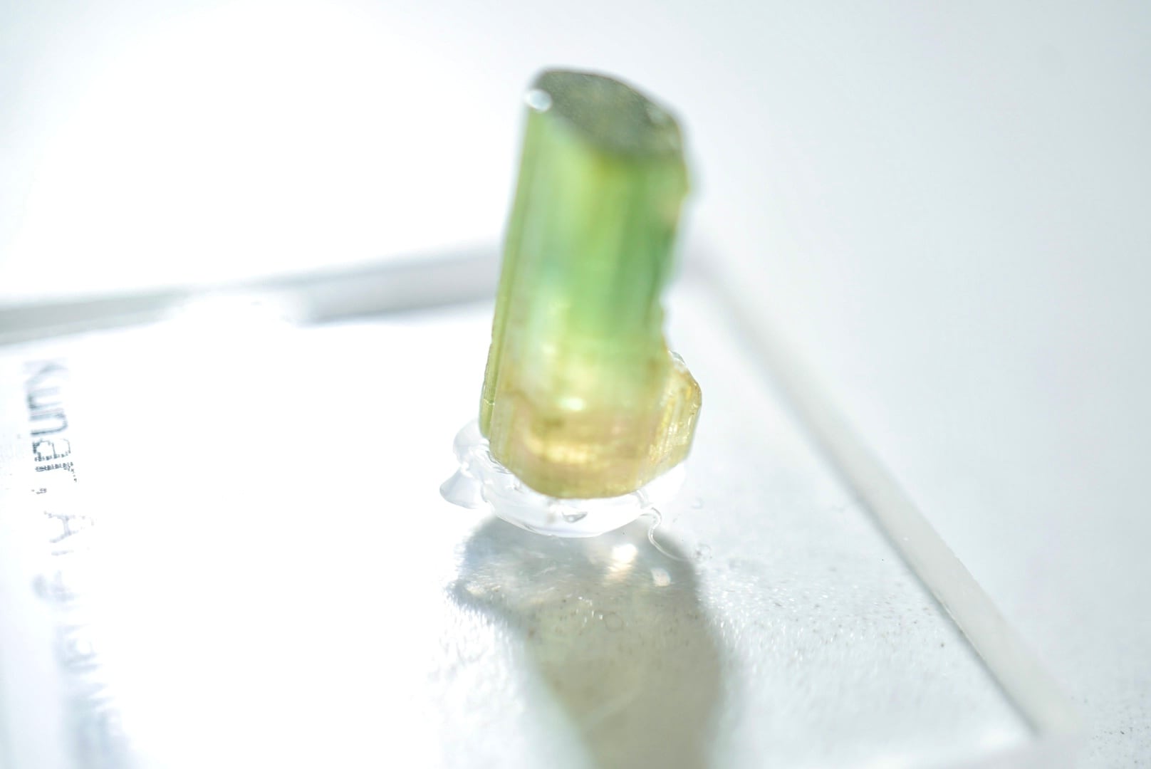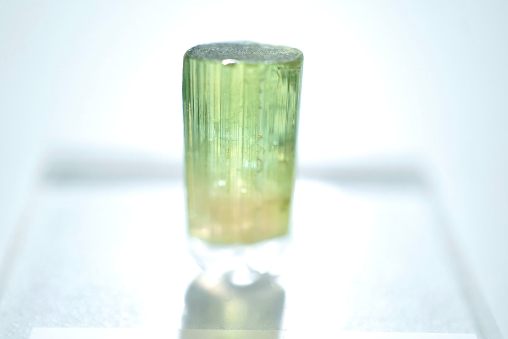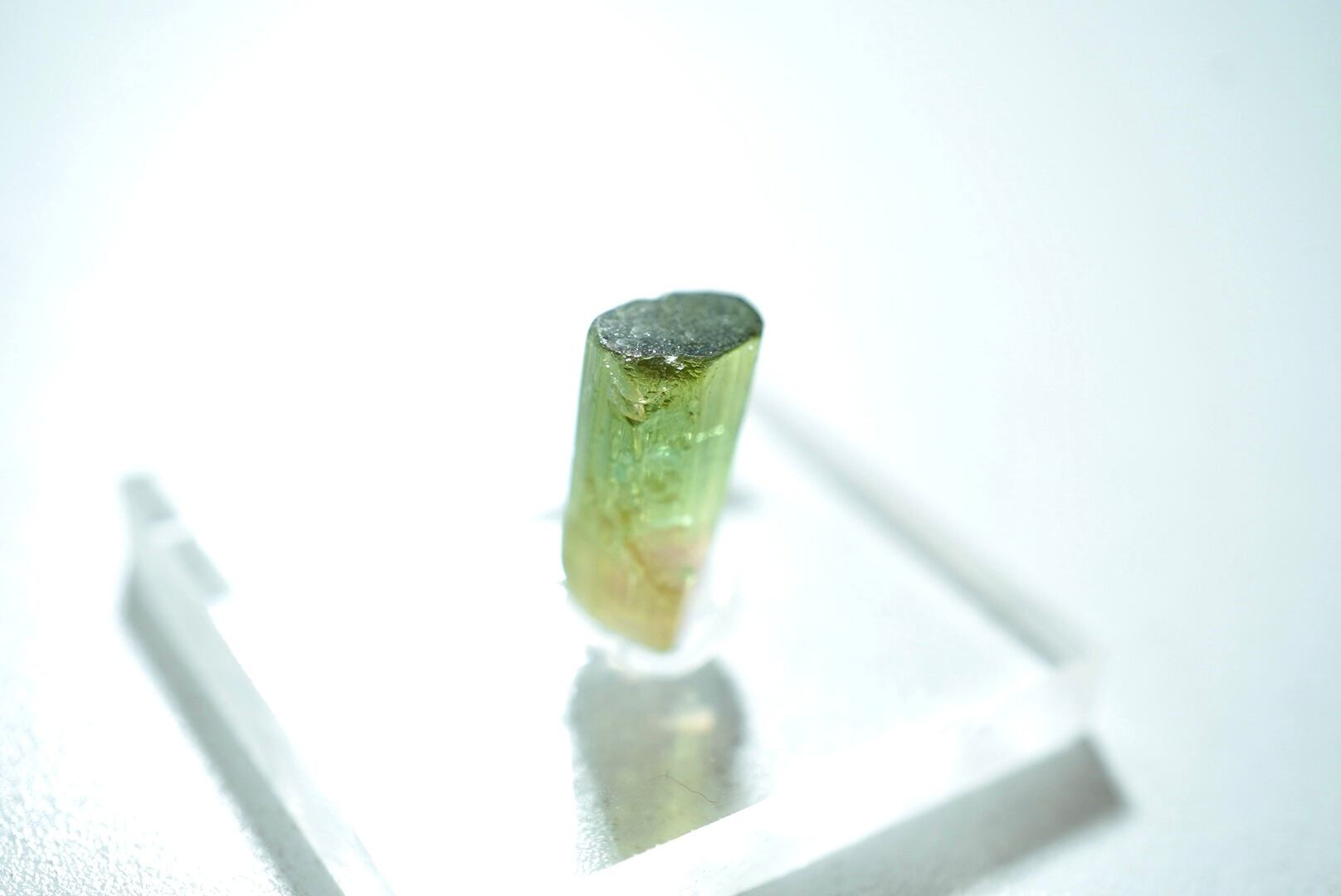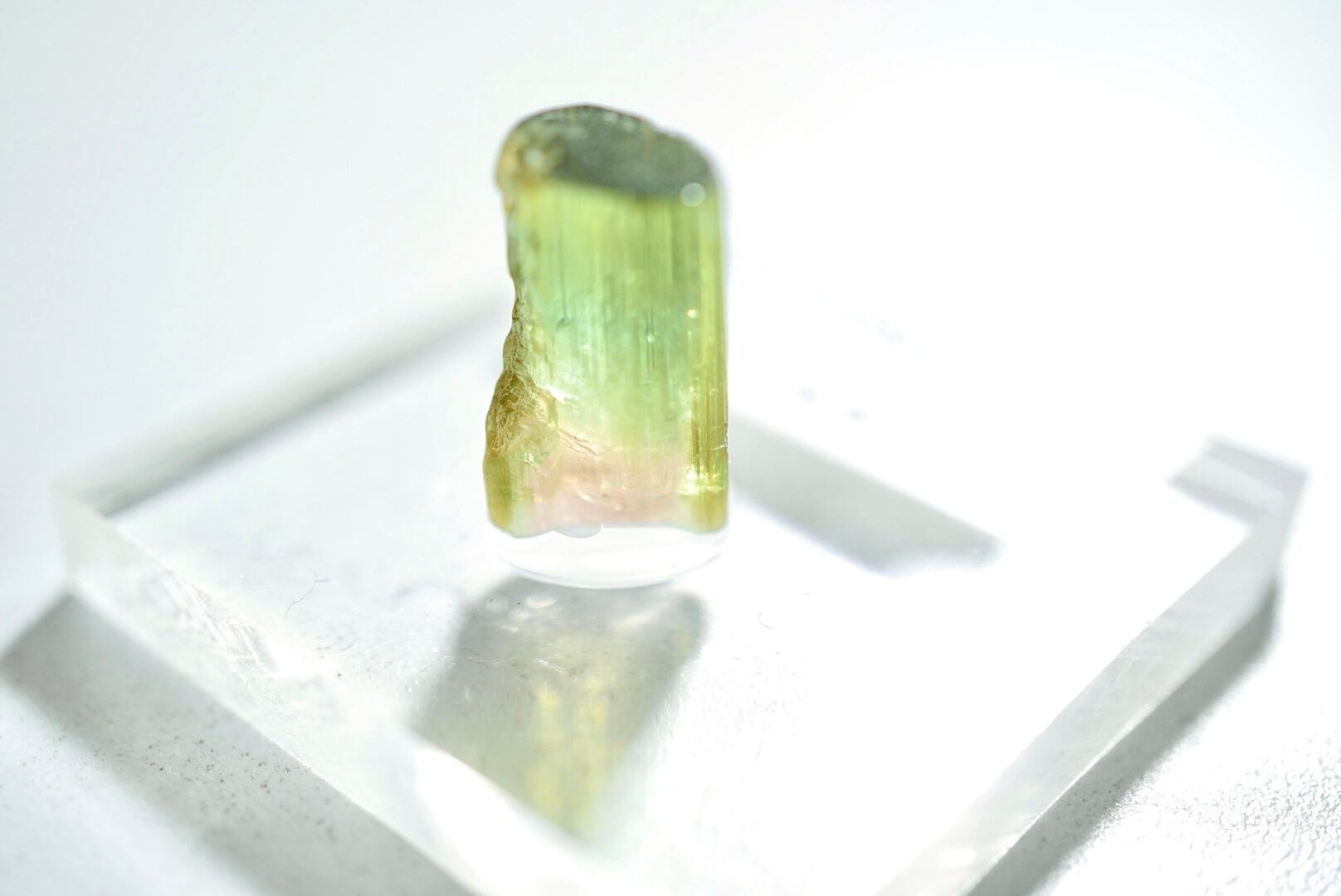 澄んだグリーンとボトムの柑橘系の色味が華やかな柱状結晶です。