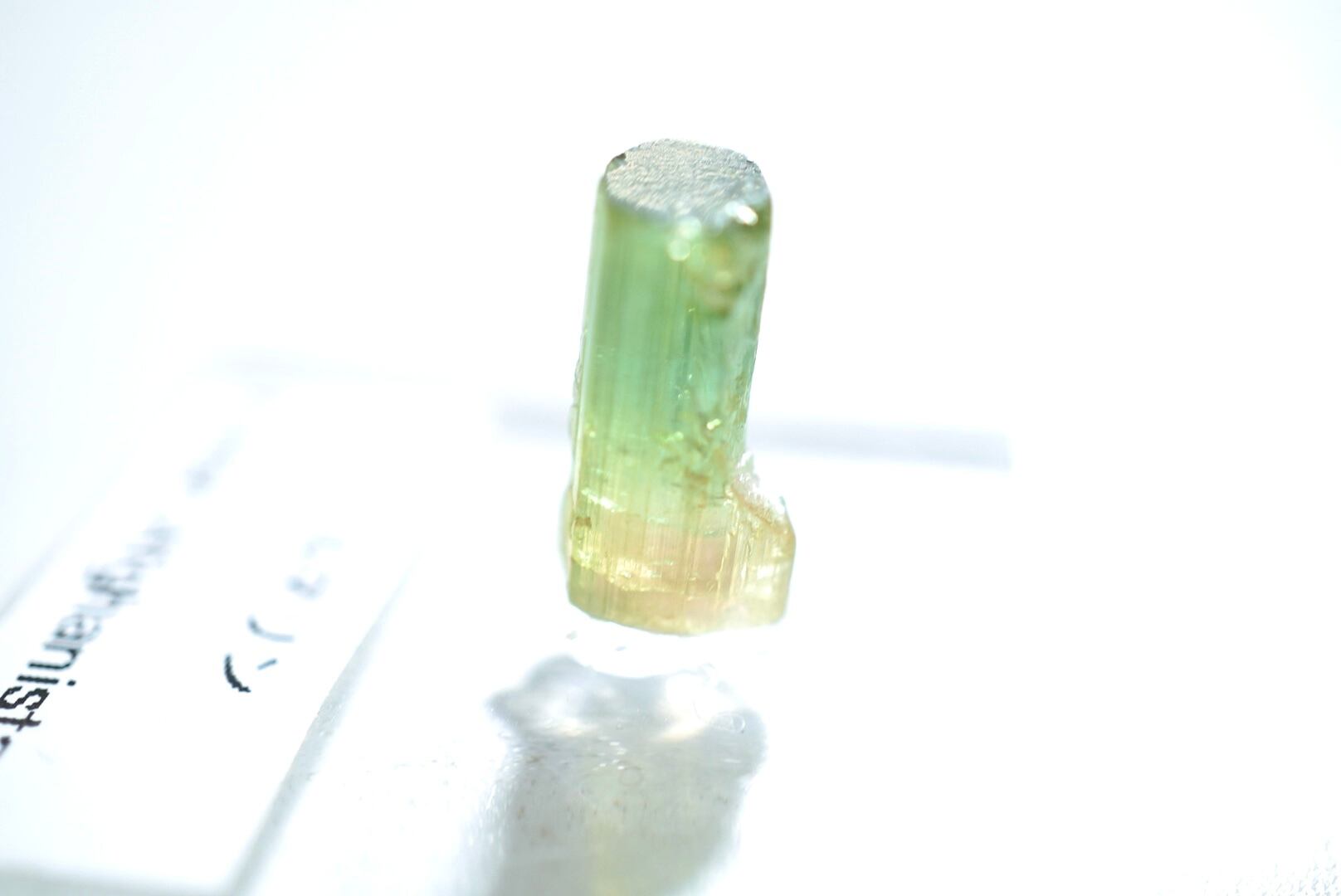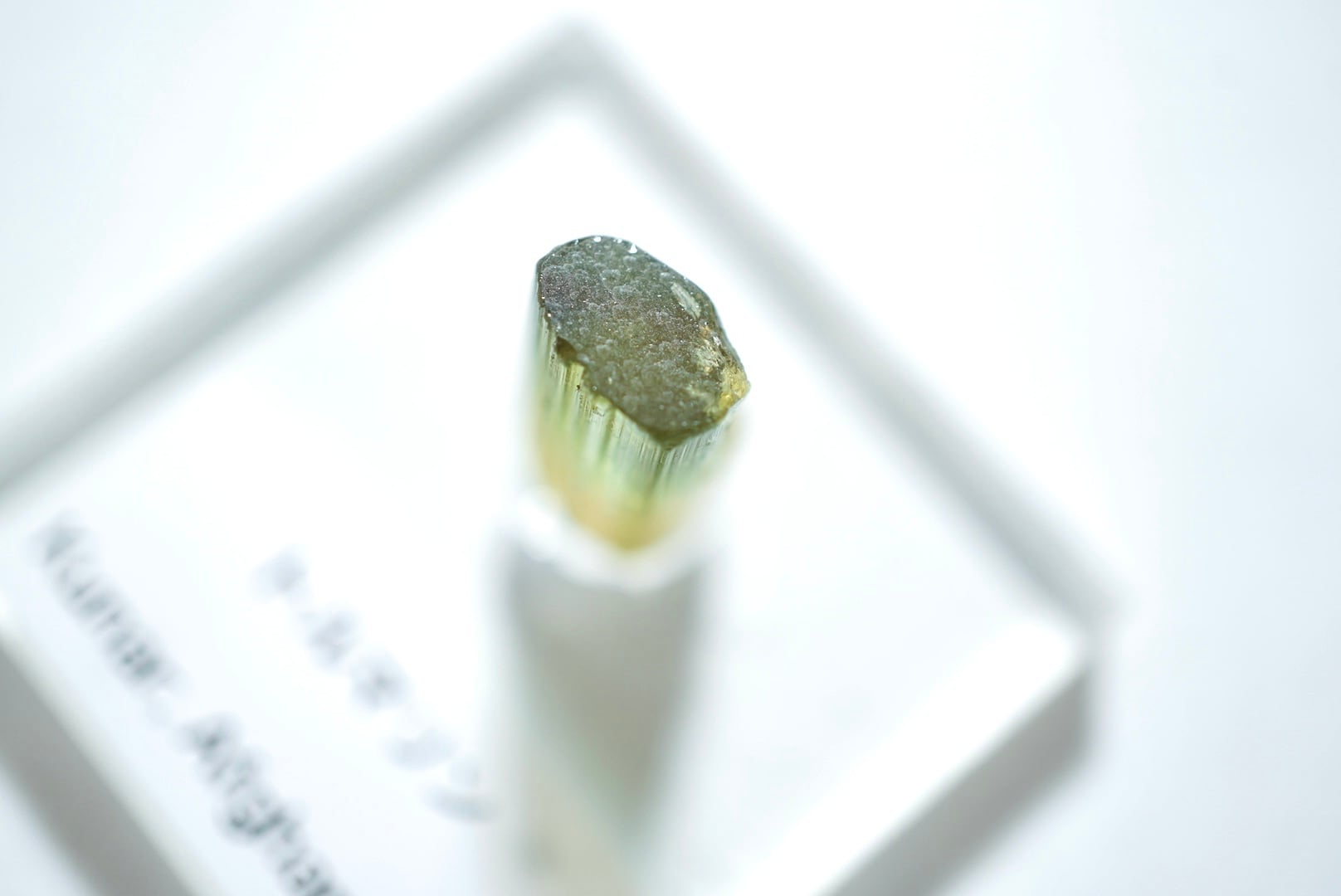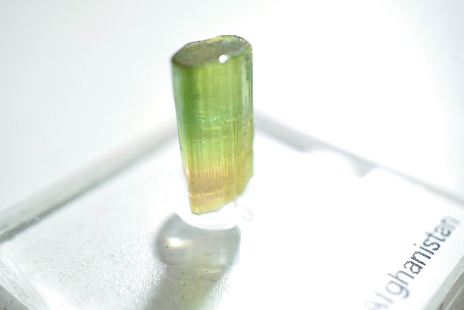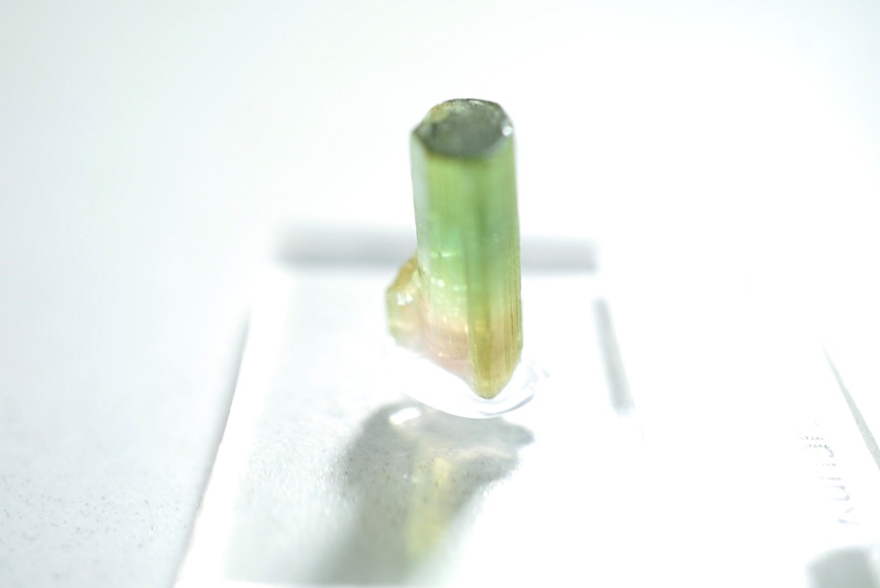 澄んだグリーンとボトムの柑橘系の色味が華やかな柱状結晶です。