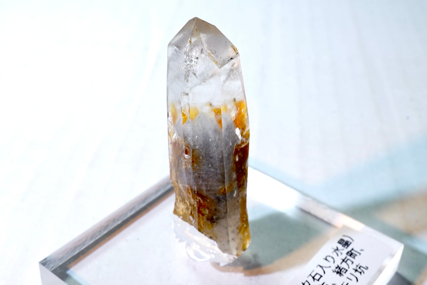 透明な水晶の中の内包物がとてもユニークなまりも水晶の標本です。