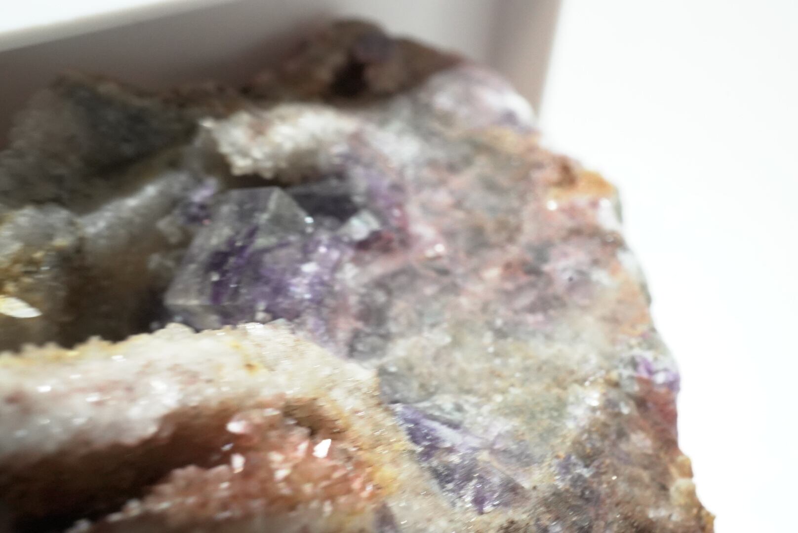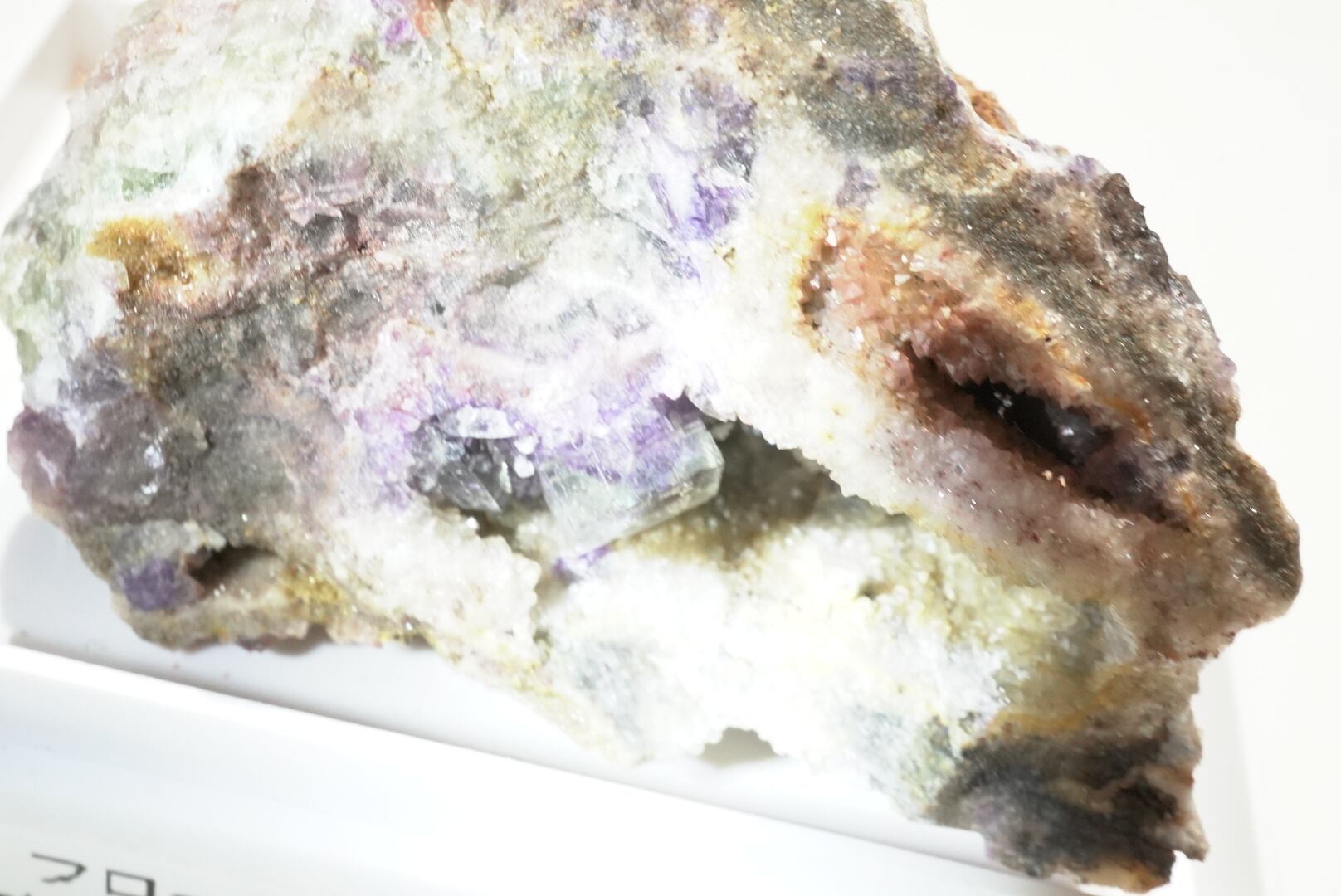 こちらは岩盤のなかの空洞に小さく結晶したフローライトを