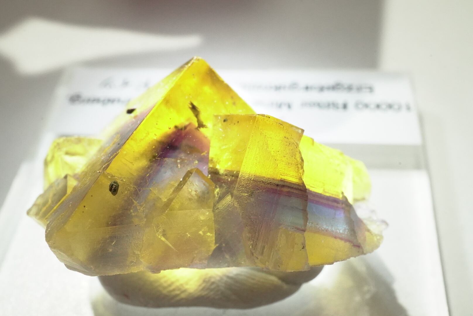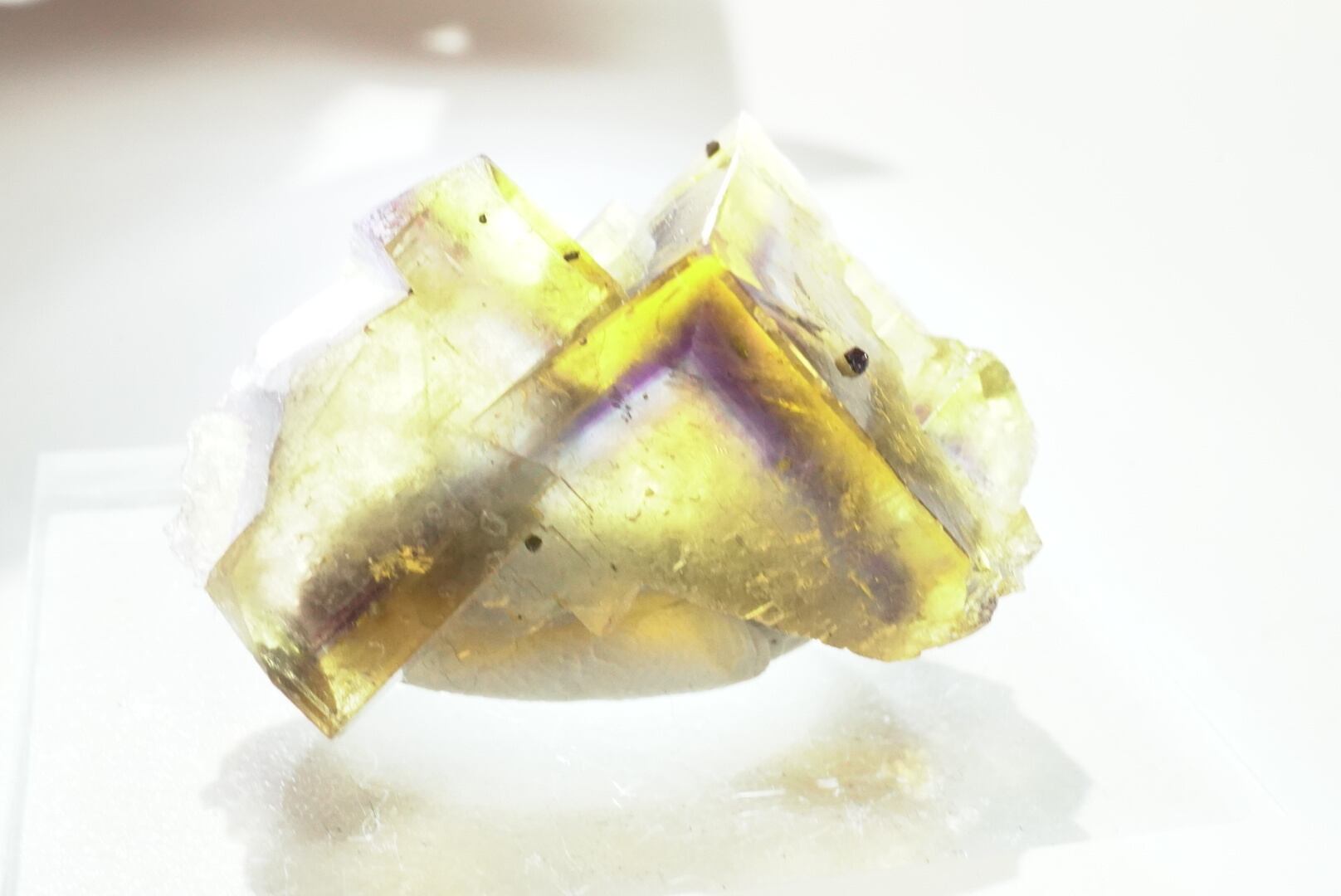 こちらは蜂蜜黄色に、紫色でサンドされたブルーのゾーニングがはっきり見えるゴージャスな結晶です。