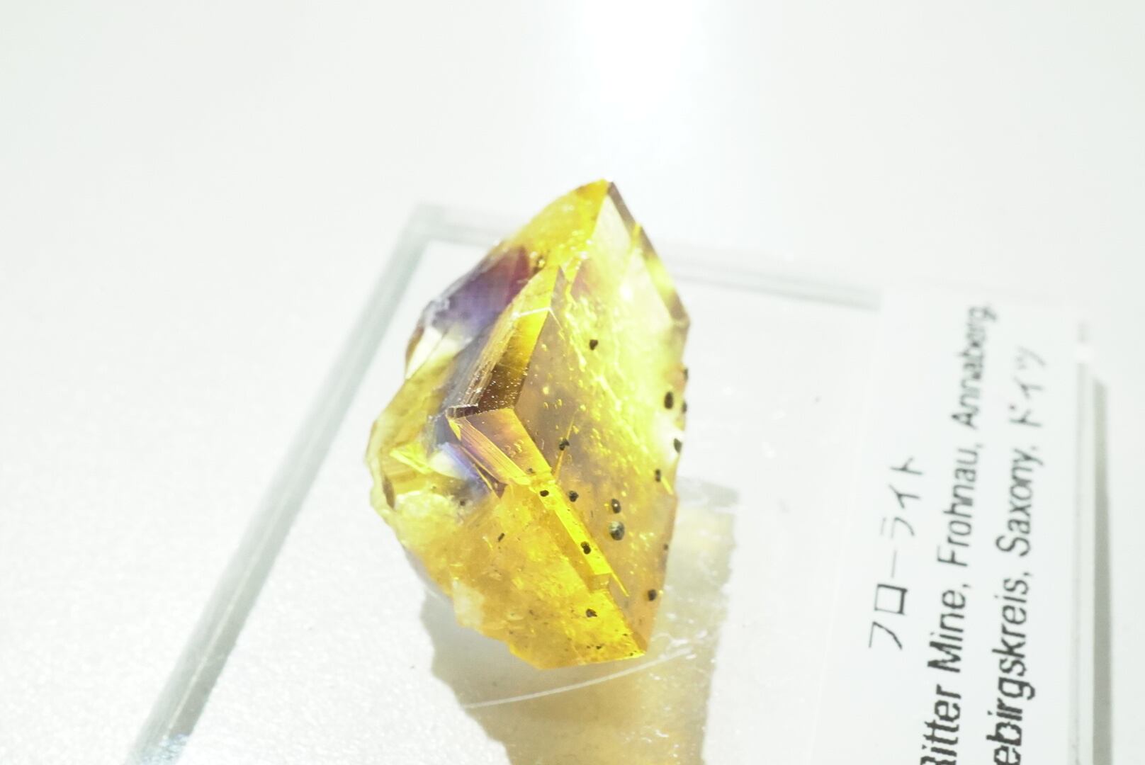 この産地のフローライトはレインボーではなく、蜂蜜黄色にゾーニングが入ったものが多い。綺麗なものだと紫と青が何層にもなった細いゾーニングがあり、光を透かすと蜂蜜黄色はレモン色になり、非常に清々しい。