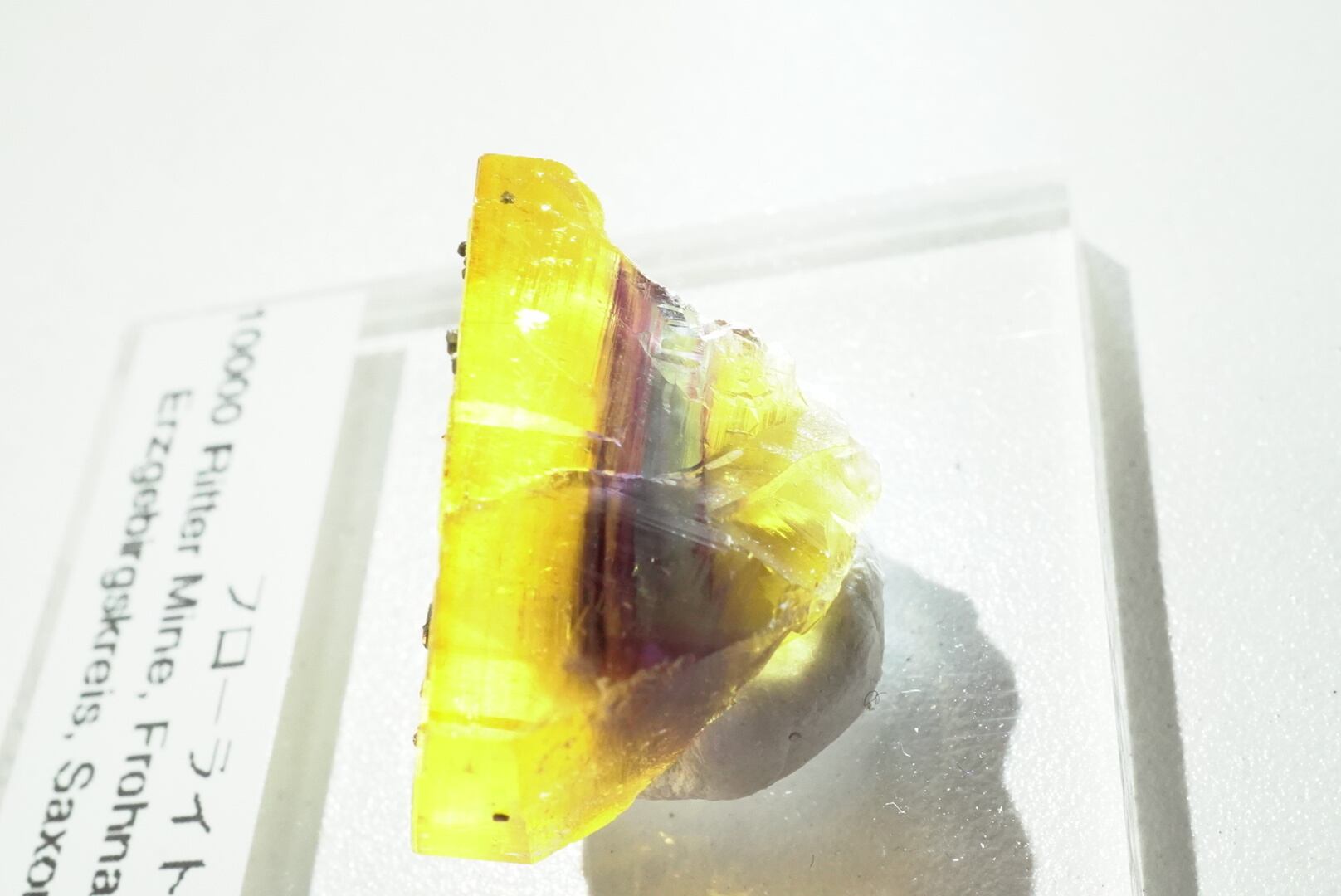 こちらは蜂蜜黄色に、紫色でサンドされたブルーのゾーニングがくっきり見える単結晶です。
