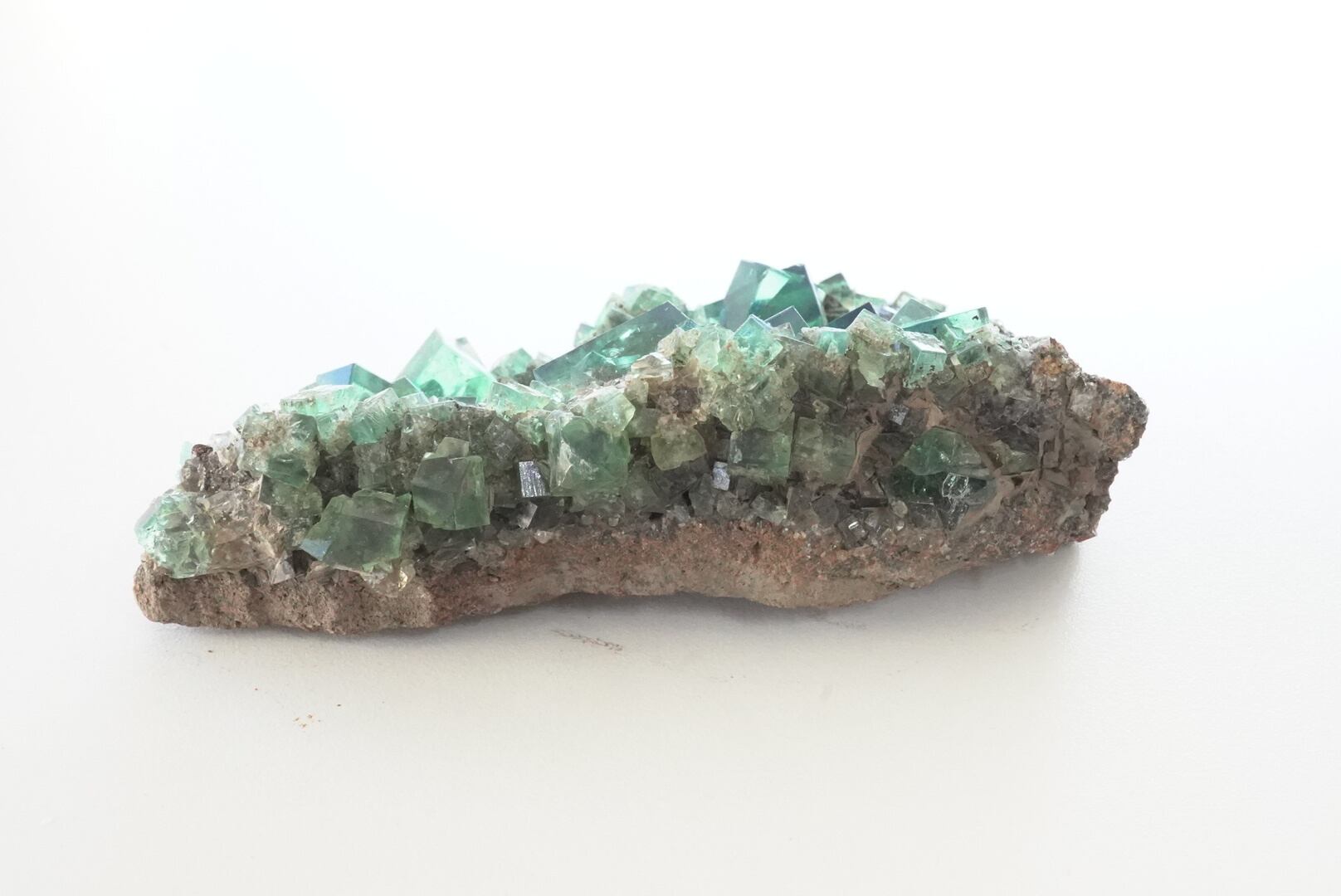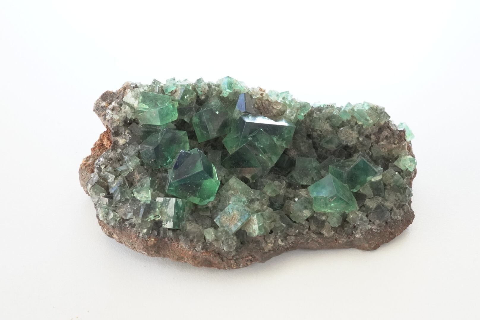 エメラルドのような緑のフローライト双晶が、鉄を含んだ母岩に乗っています。