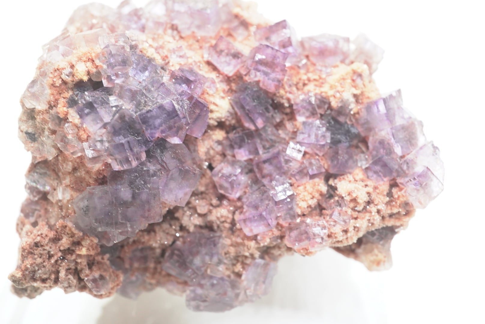 薄い翠色から紫の立方体のフローライト結晶が散りばめられた標本です。