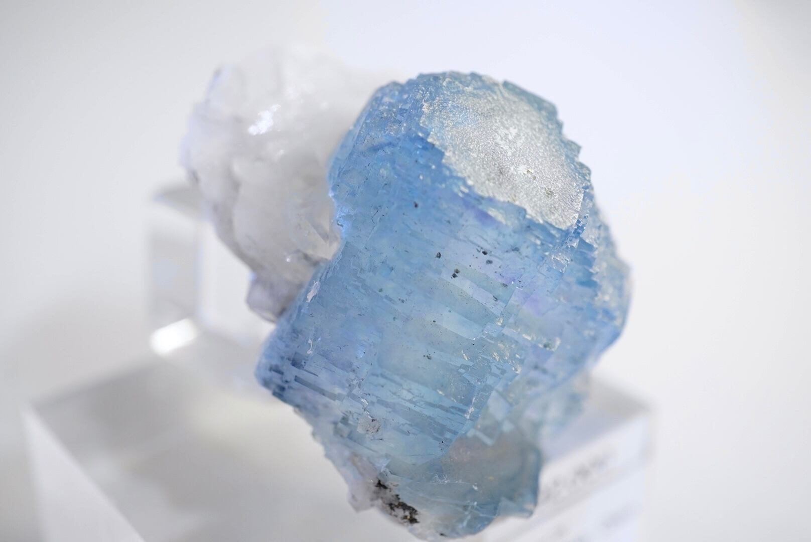 白い石英の上に花咲いた、ほんのりラベンダーのニュアンスのあるブルーフローライト。