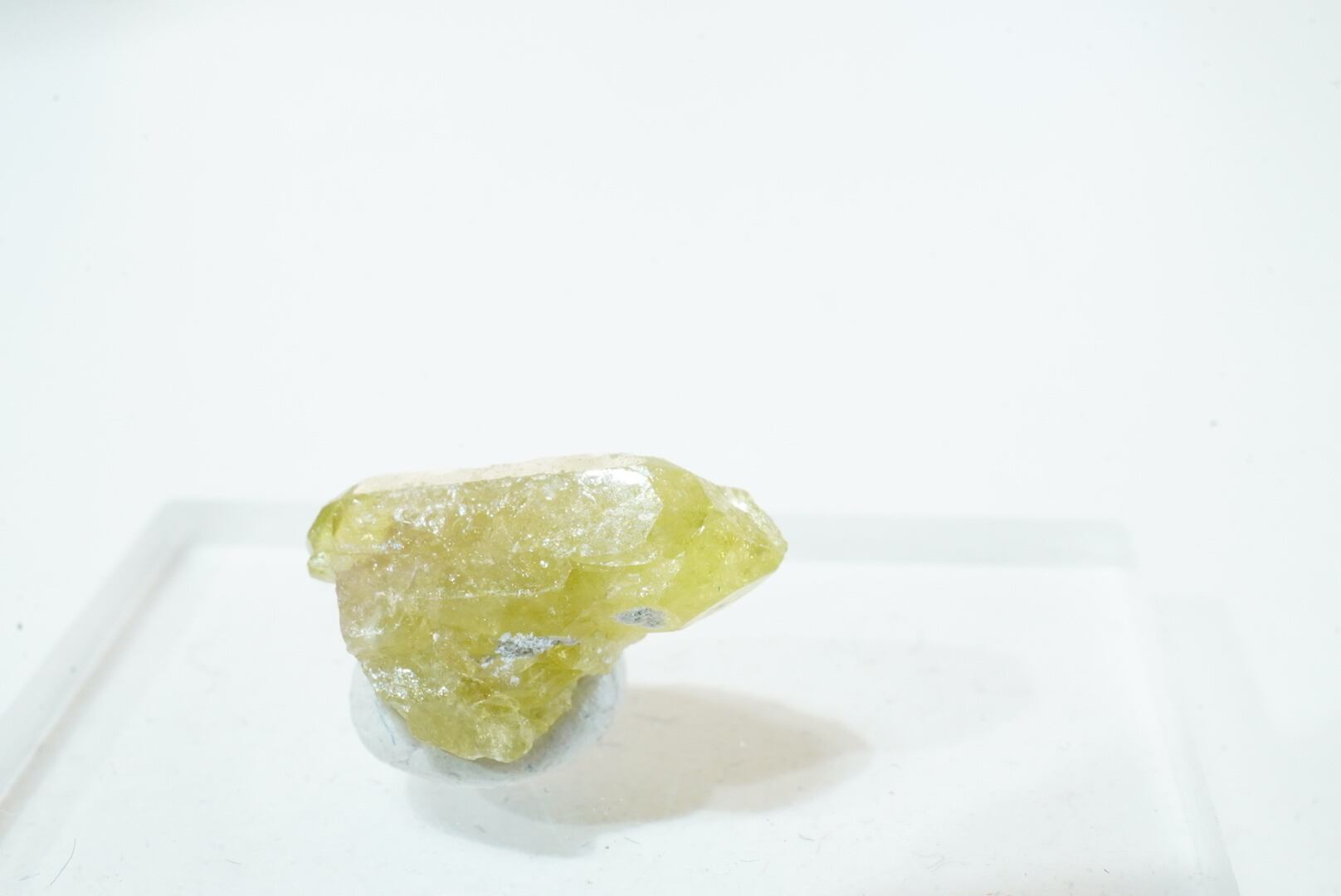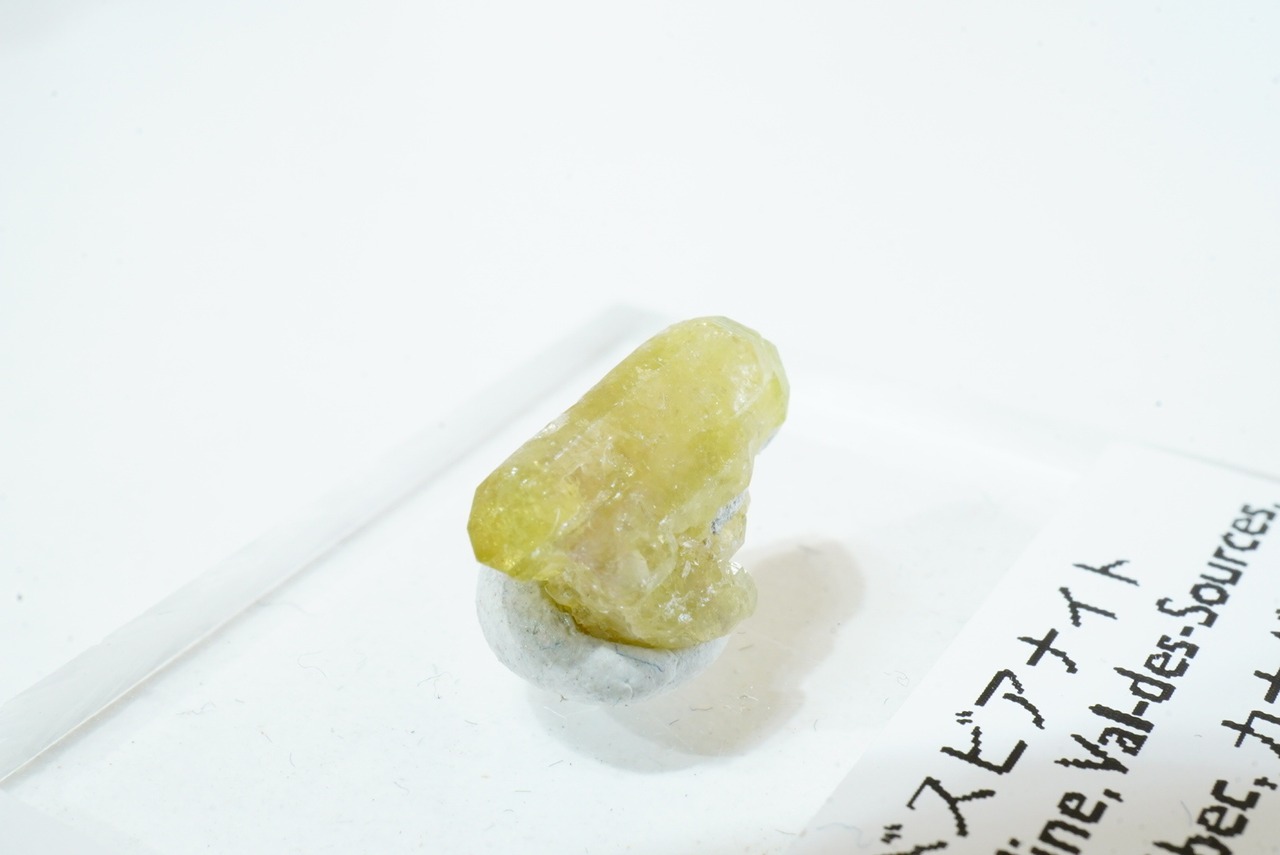 中央がうっすら赤みのある、黄緑色の両錐結晶。