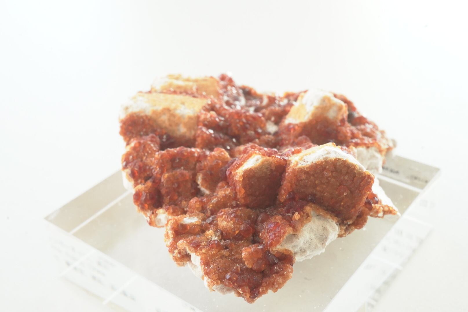 透明で非常に小さなガーネットはひとつひとつ丸っこく斜方12面体に結晶していて、