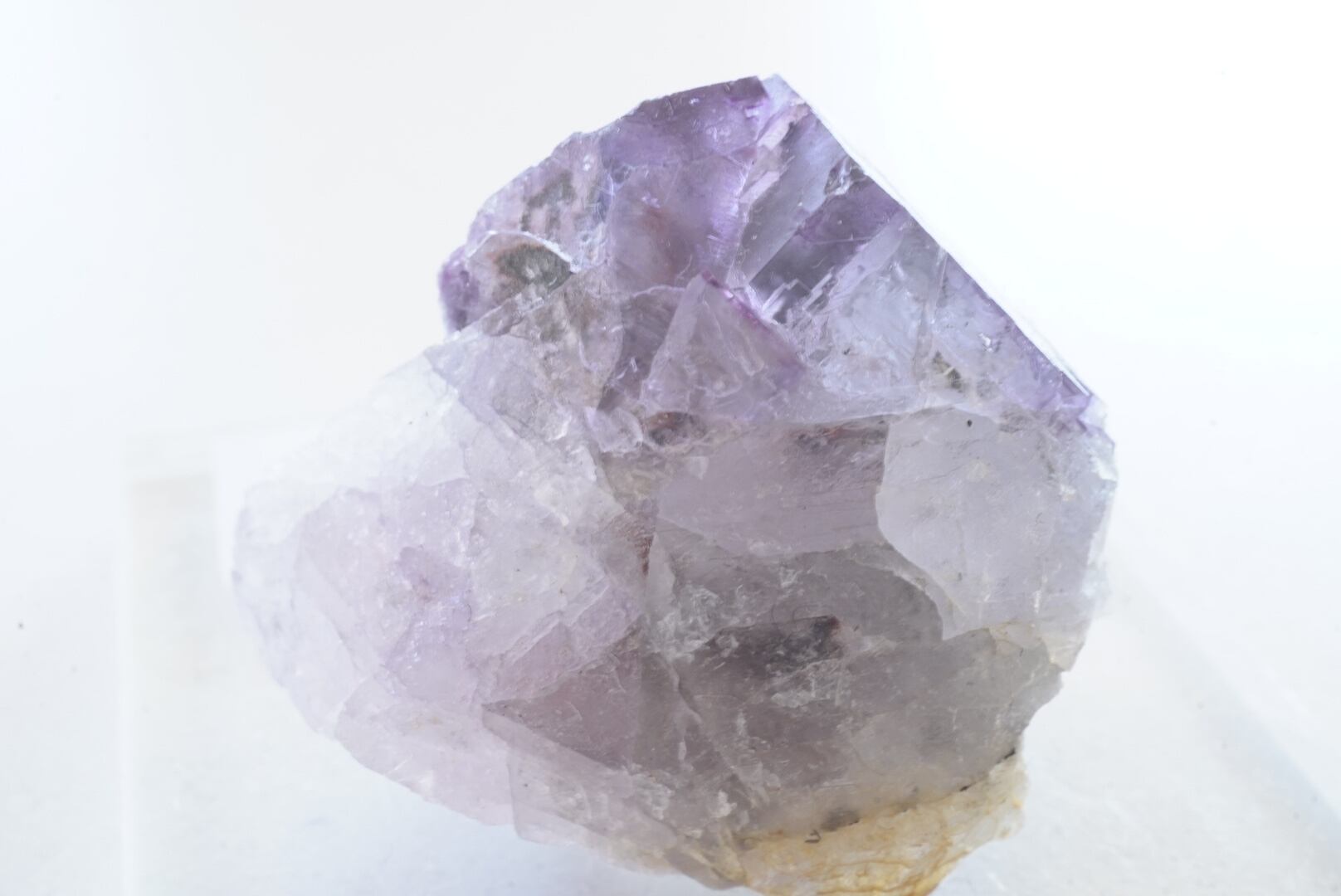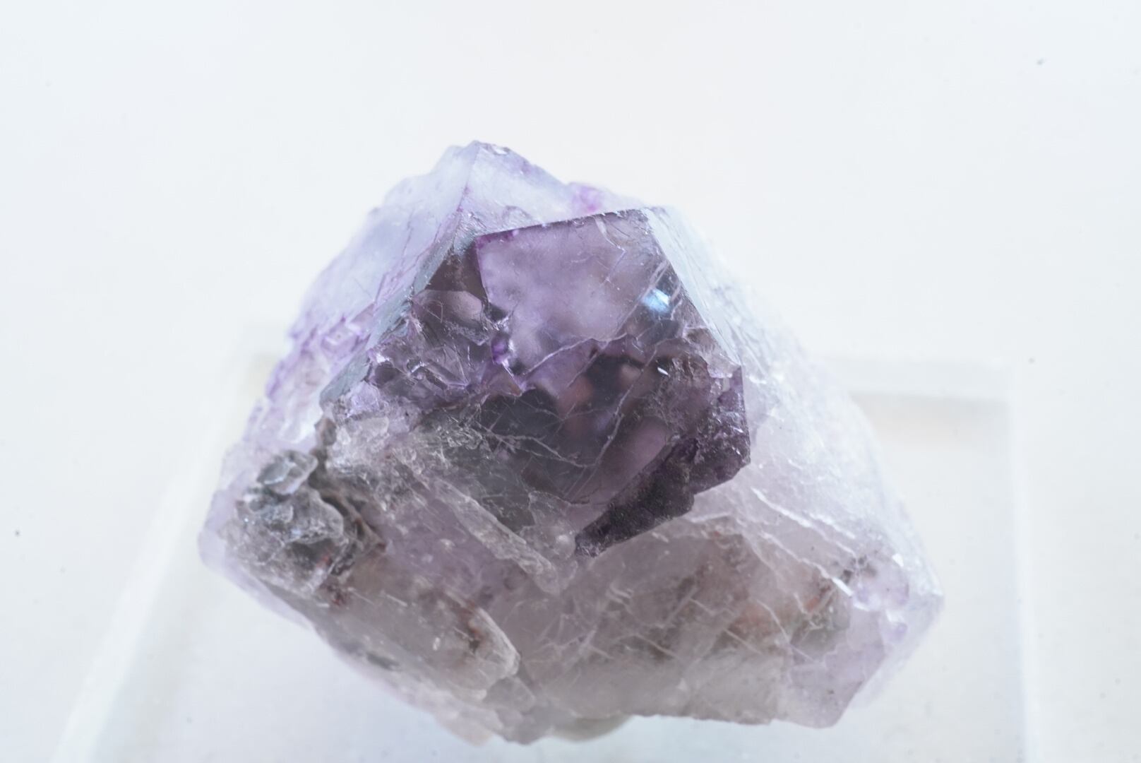 透明なフローライトの結晶部分のエッジに紫ゾーニング。