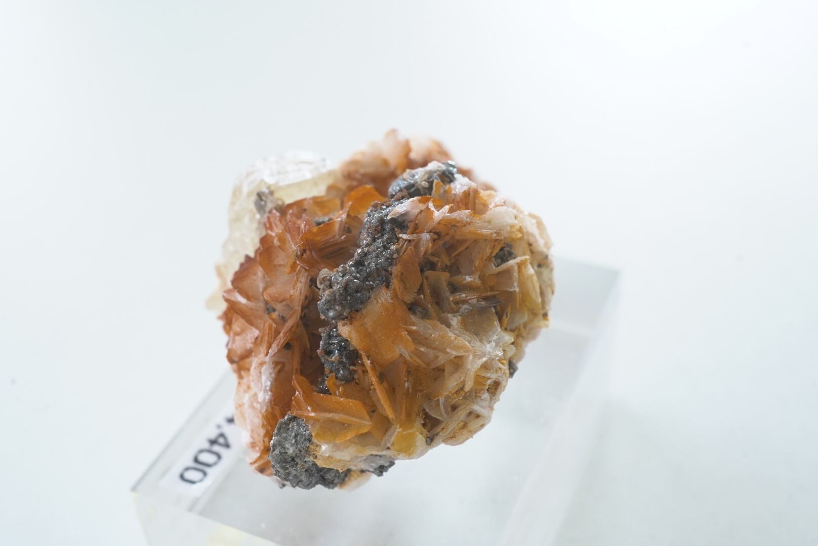 オレンジのモコモコバライトを従えたセルサイト(白鉛鉱)。