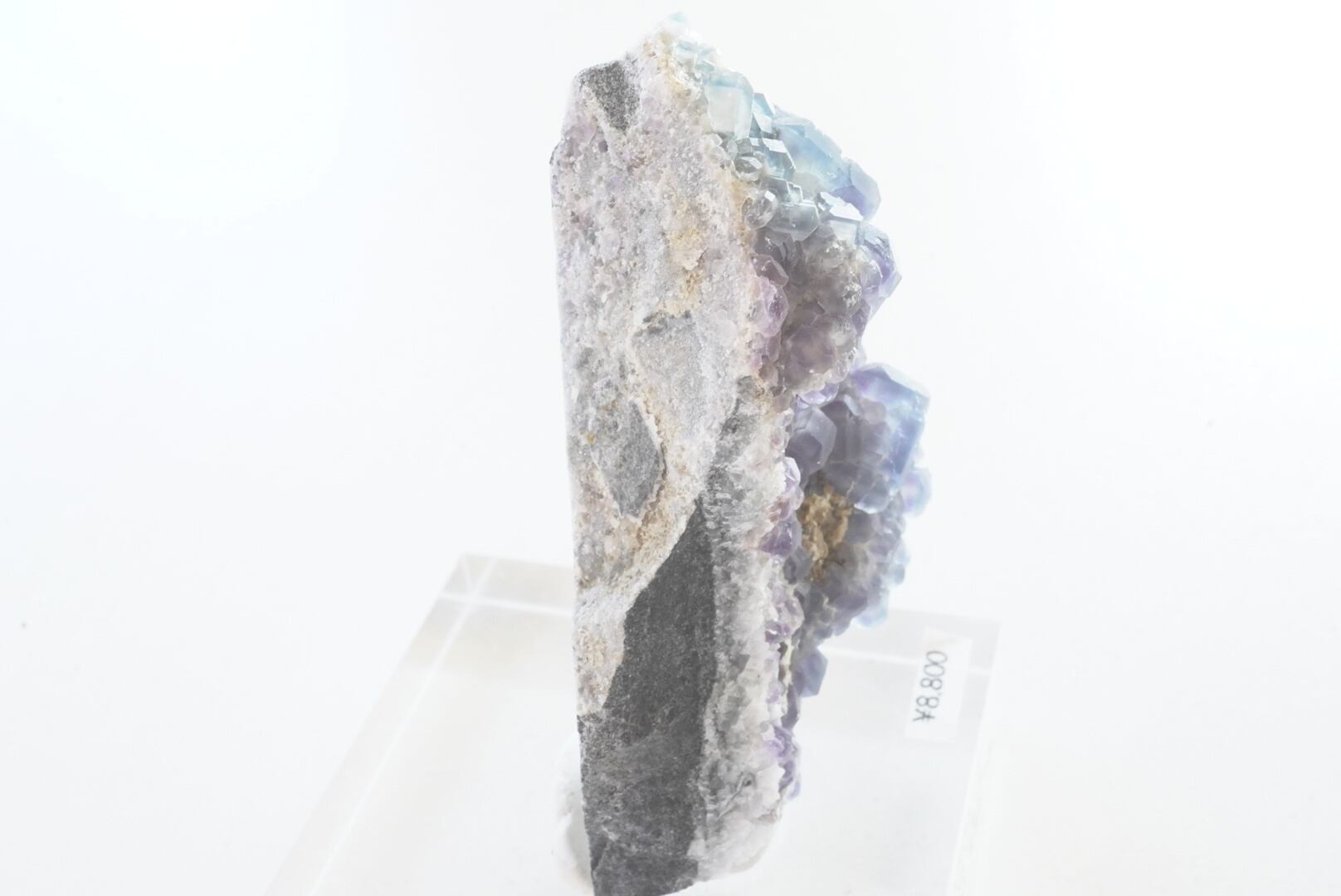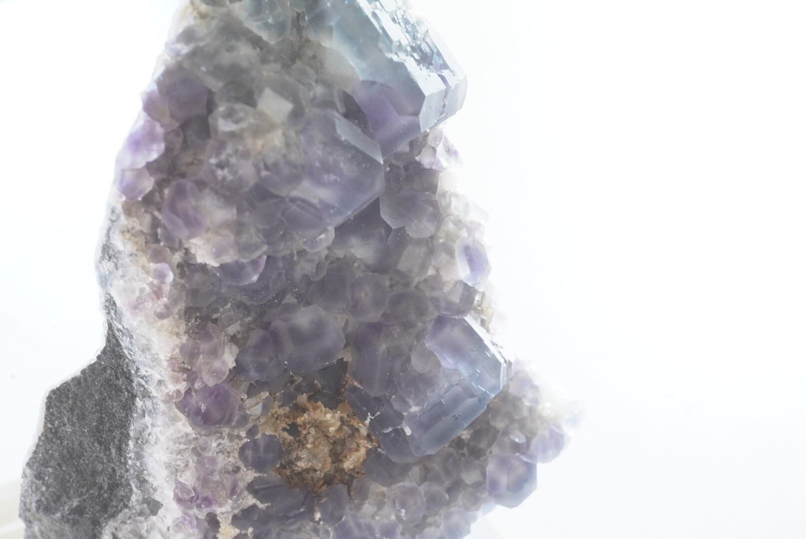 濃いめの青緑と紫のバイカラーのフローライトの結晶が、