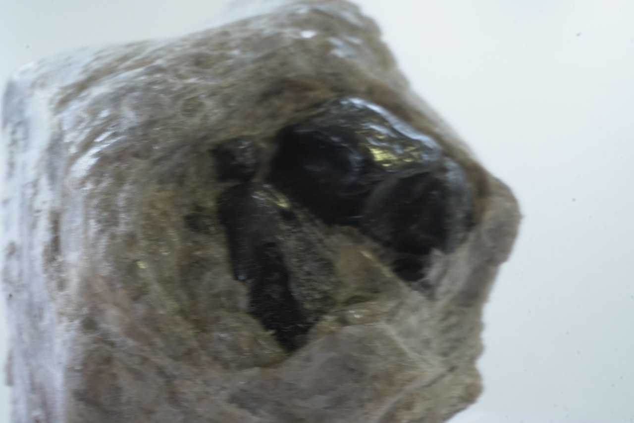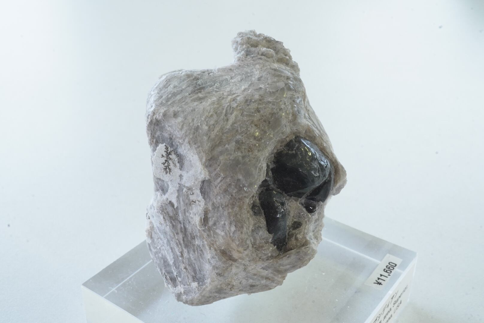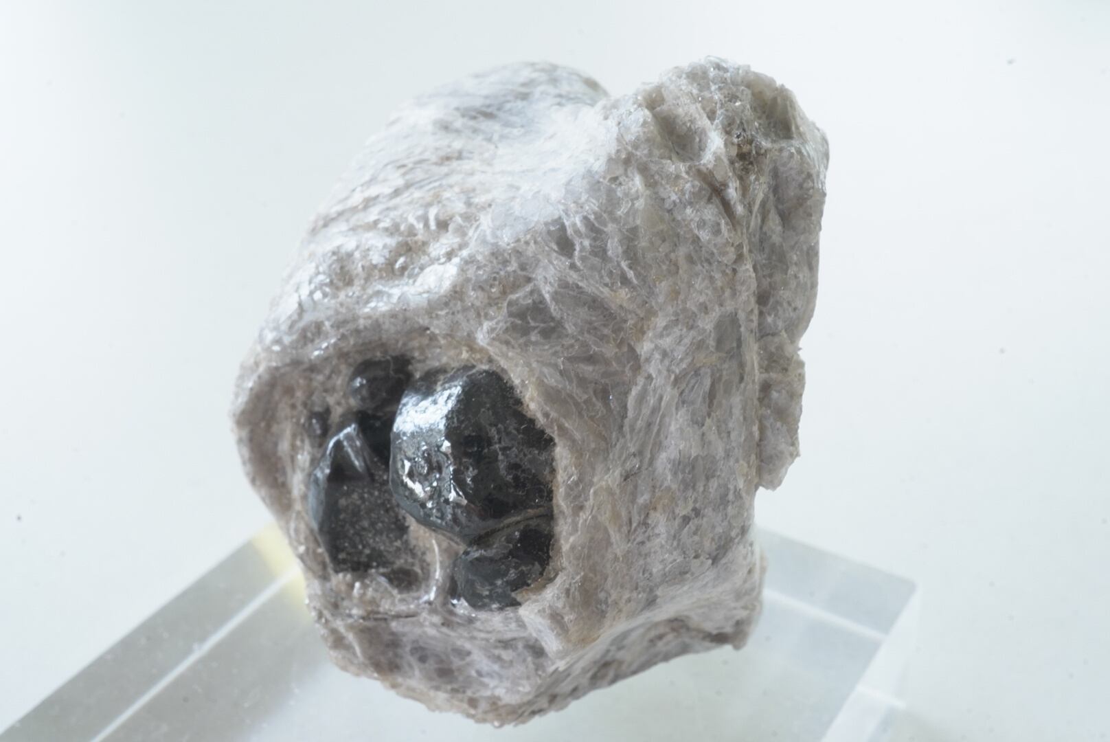 光沢のある白い母岩の中に、ツヤっと抱かれる黒い丸っこい黒曜石。