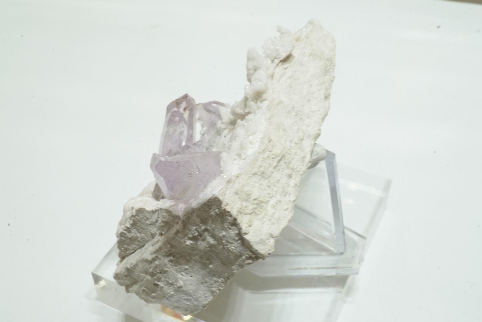 真っ白い母岩にピンクがかった明るいアメジストの結晶が乗った標本です。