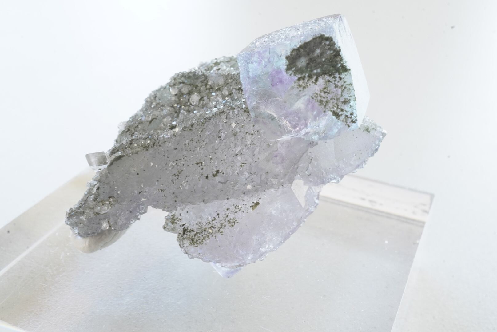 フローライトの水色のえぐれたキューブ状結晶がちょこんと乗った標本です。