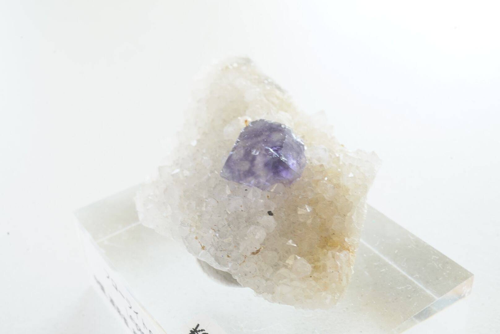 紫の色帯が渦を巻くようなフローライトの透明な結晶が一粒のっています。