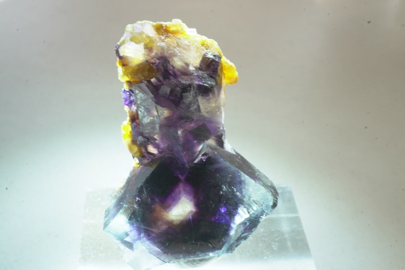 水色のキューブ状フローライトの中に濃い紫、真ん中にはまた透明な水色のキューブが入った綺麗な結晶。