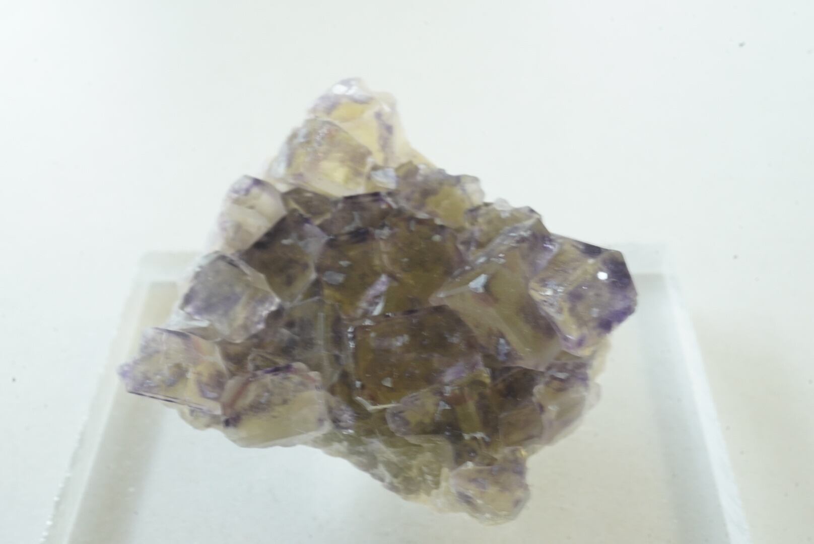 ひとつひとつの結晶はグレイッシュな黄色にバイオレットのゾーニングが入っていて、