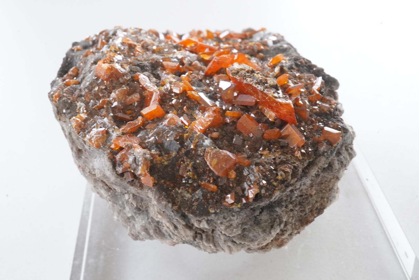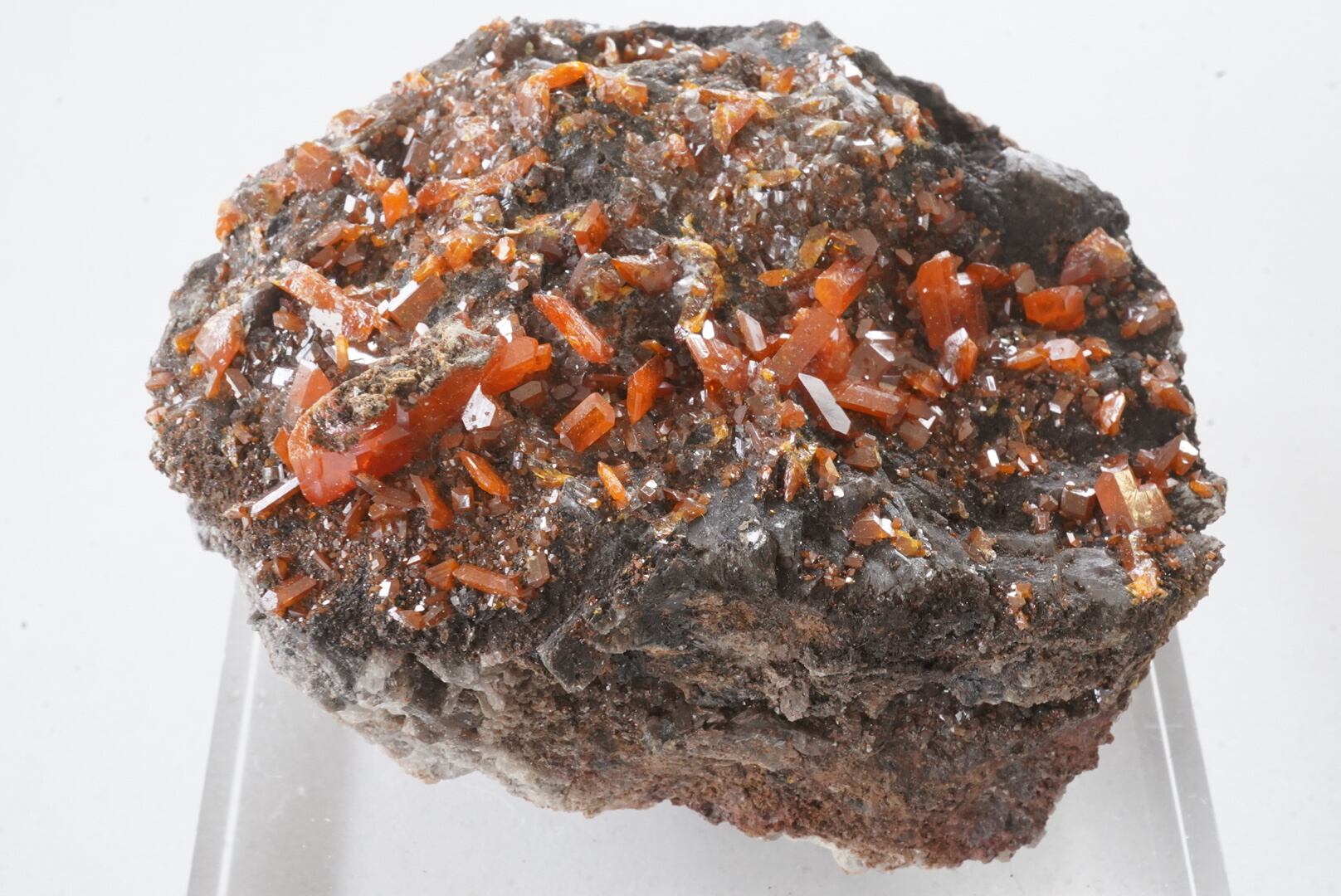 艶やかで鮮やかな夕日のような朱赤のウルフェナイト結晶のクラスターです。