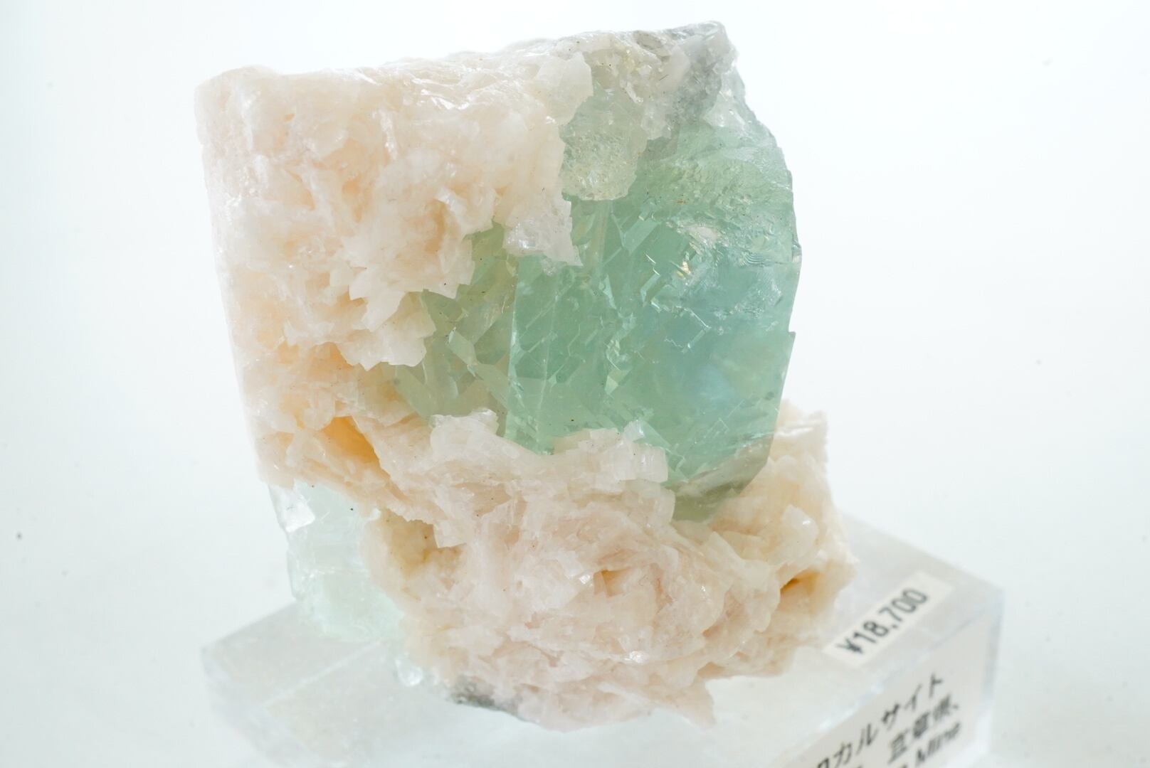 さくらの花のようなカルサイトからミントカラーのフローライトが顔を出したような標本です。